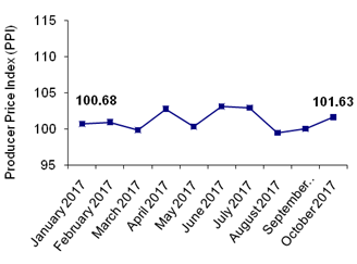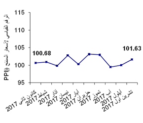 الرقم القياسي العام لأسعار المنتج يسجل ارتفاعاً نسبته 1.62% خلال شهر تشرين أول 2017 مقارنة مع شهر أيلول 2017، حيث وصل الرقم القياسي العام إلى 101.63 خلال شهر تشرين أول 2017 (شهر الأساس كانون أول 2015 = 100).