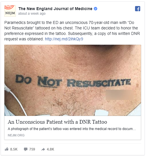 وخلال قيام الأطباء بمحاولة إنعاش المريض المجهول، لاحظوا وجود وشم كبير على صدره، يقول "لا تُنعشوني".