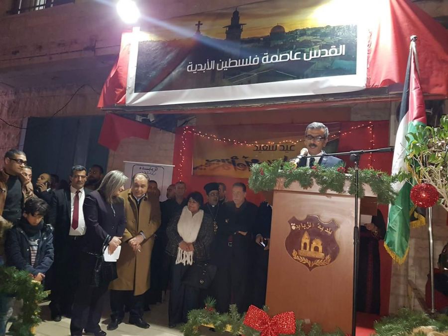 وأكد دعيبس في كلمته على أن الأعياد الميلادية المجيدة تحمل طابع مختلف هذا العام نظراً للفترة العصيبة التي يمر بها شعبنا الفسطيني،لكنه أيضاً وضع ليس ب جديد فالمؤامرة ما زالت منذ وعد بلفور تحاك ضد شعبنا و أرضنا الى أيامنا هذه ، الأيام المشؤومه التي سمح فيها ترامب رئيس الولايات المتحدة الأمريكية لنفسه بالإعتراف بالقدس عاصمة ل إسرائيل وإعلان نقل السفارة الأمريكية للقدس على مرأى ومسمع العالم أجمع، جاهر ب قرار مخالف لكافة الشرائع والمواثيق الدولية ويعد بمثابة الضوء الاخضر للكيان الصهيوني للاستنزاف في توسعة إستيطانه وخطته الخبيثة بتهويد الأرض و تشريد الشعب.