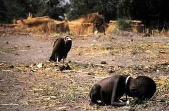 6 - طفل صومالي جائع ينتظر موته نسر جائع عام 1994: تسببت صورة تجمع طفلا صوماليا على وشك الموت من الجوع مع نسر يبدو أنه جائع أيضا يترقب وفاته لينقض عليه بضجة عالمية سلطت الضوء على مأساة هذا البلد الفقير الذي تضربه النزاعات، وتعد من أكثر الصور الصادمة التي أثارت الرأي العام وتسببت بانتحار المصور الذي التقطها بسبب الهجوم عليه من قبل منظمات دولية.