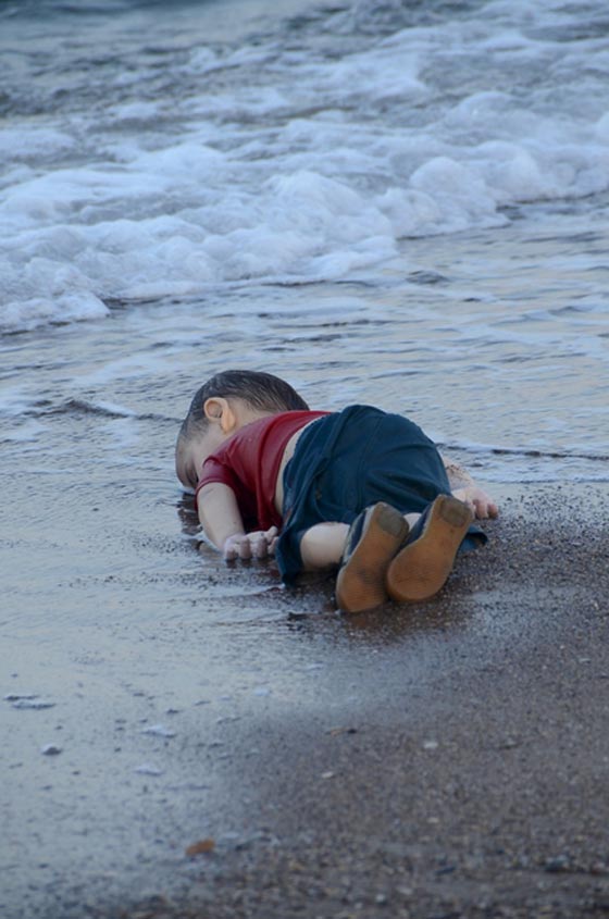 2 - إيلان الكردي 2015: أصبحت صورة الطفل إيلان الكردي الذي توفي غرقاً أثناء محاولة عائلته الهروب من الحرب الدائرة في سوريا جرحا في جبين الإنسانية التي لم تستطع توفير الأمن له ولأسرته وآلاف مثلها، ما دفعهم للمخاطرة بحياتهم للهرب من الموت جوعا أو قصفا أو ذبحا في بلادهم إلى الموت غرقا.
