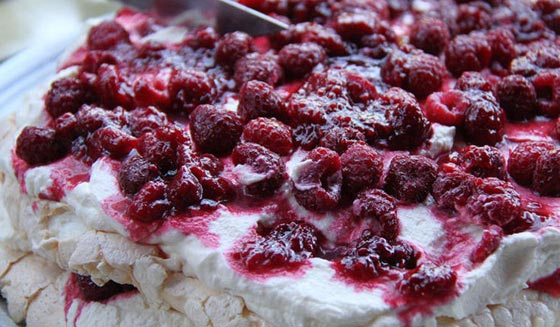 كعكة بافلوفا، التي اخترعت في نيوزلندا وسميت تيمناً براقصة الباليه آنا بافلوفا. وهي عبارة عن طبقات من المرنغ المغطاة بالكريمة وفاكهة فصل الصيف