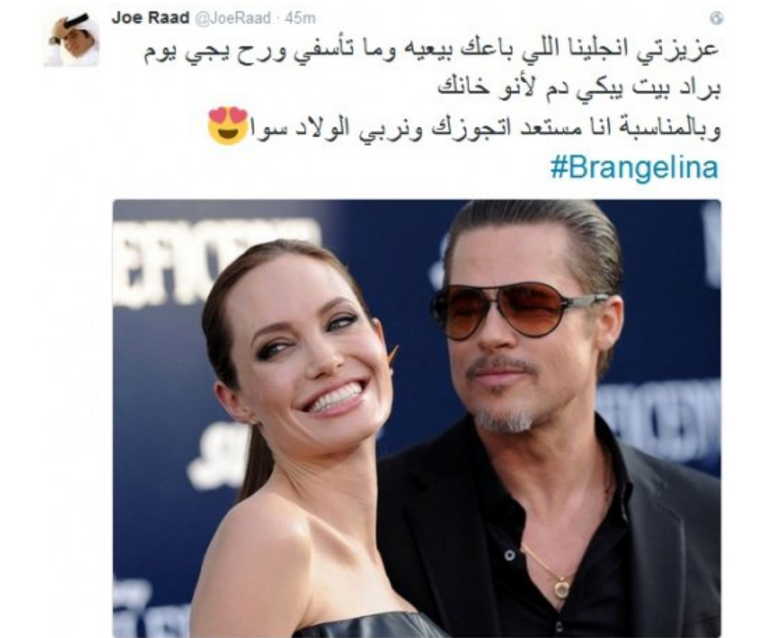 صبا.نت-نشر الفنان اللبناني المثير للجدل جو رعد، عبر حسابه الرسمي على "تويتر"، صورة للثنائي العالمي انجلينا جولي وبراد بيت، مع انتشار خبر انفصالهما.