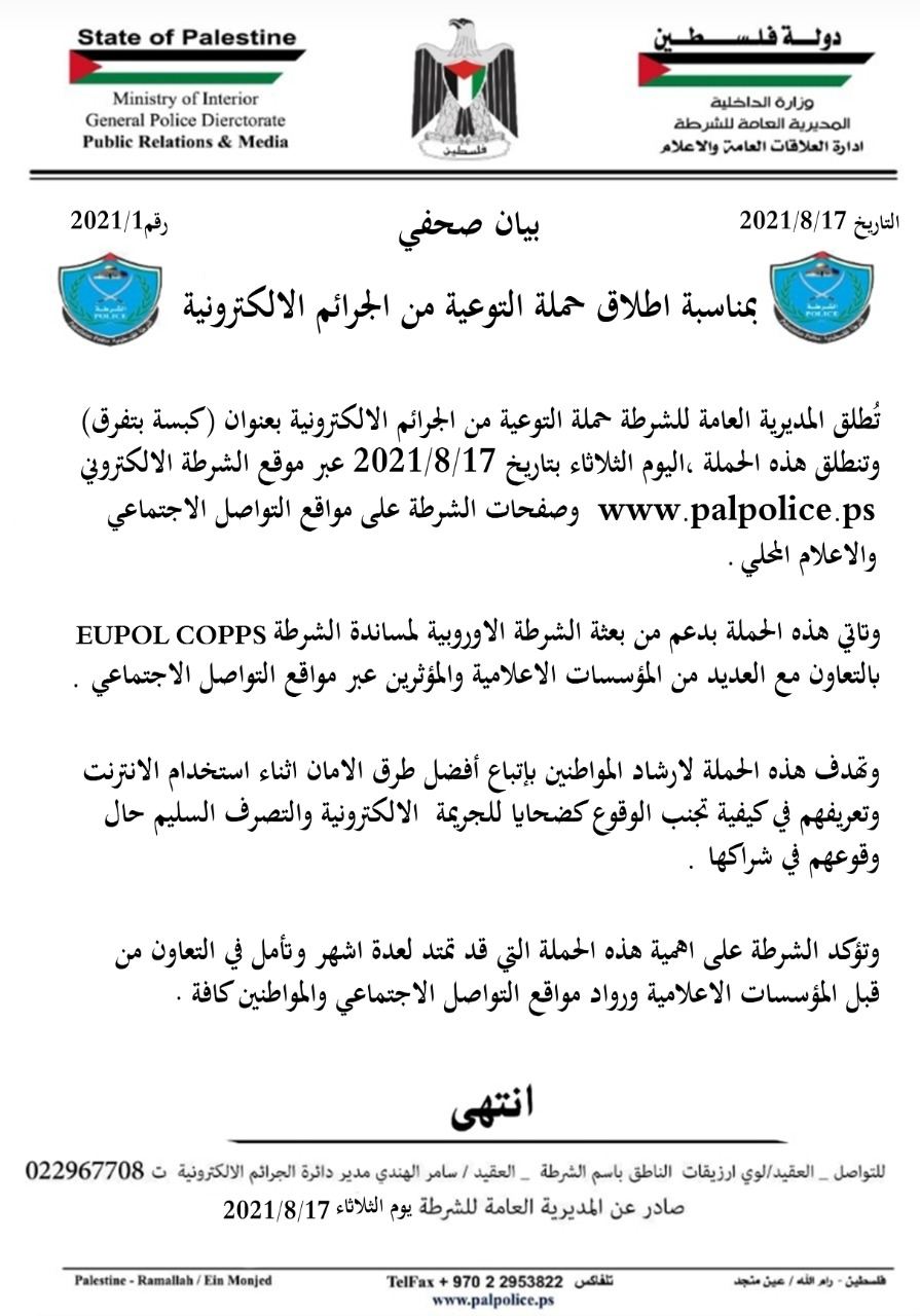 المديرية العامه للشرطة تطلق حملة توعيه من الجرائم الإلكترونية بعنوان " كبسة بتفرق " صبا.نت calendar_month17/08/2021 11:43 visibility 682 مقالات ذات صلة share سلطة الأراضي ووزارة الاتصالات وبلدية رام الله يوقعون مذكرة تفاهمshare انطلاق "ماربيلا بيوتي" للمنتجات النسائية في فلسطين share المواصفات والمقاييس تعلن نتائج مسابقة زيت الزيتون الذهبي لعام 2025share "التربية" تفتتح مدرسة بنات كفر قدوم الأساسية في قلقيلية تزامناً مع بدء الفصل الدراسي الثاني
