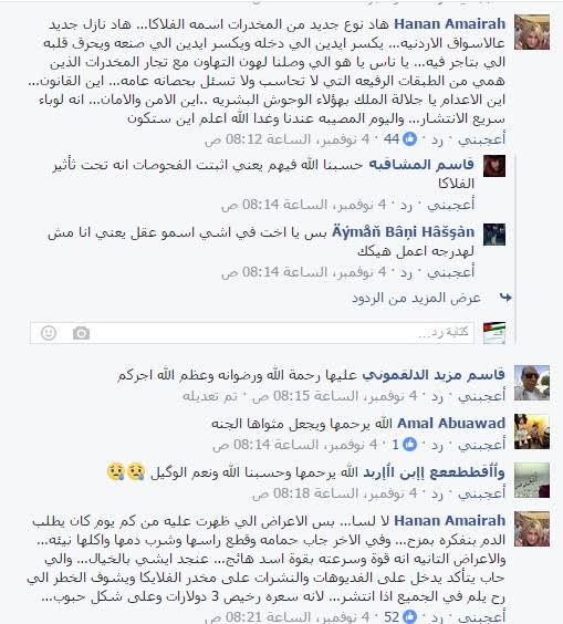 وكانت عمة القاتل تلقت العديد من رسائل التعزية التي تخللها أسئلة عدة حول الدوافع والأسباب وراء إرتكاب ابن أخيها تلك الجريمة عبر حسابها الشخصي على "فيسبوك"، مجيبة في إحدى ردودها: "هذا نوع جديد من المخدرات اسمه فلاكا… وهو حديث الظهور في الأسواق الأردنيه"، في حين تسأل شخص أخر: "هل اثبتت التحاليل تعاطيه تلك المادة؟" فأجابت: "لا لغاية الأن لم تظهر أي نتائج، لكن الأعراض التي ظهرت على القاتل منذ أيام عدة تشير إلى ذلك، وأنه كان يرغب بتناول الدماء إلا أننا أعتقدنا بأنه يمازحنا، لكنه أحضر طائر حمام وقطع راسه وشرب دمائه وأكله نيئاً.