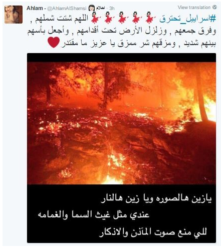 صبا.نت-بعد الحرائق التي اجتاحت عددا من المستوطنات الإسرائيلية، علقت الفنانة الإماراتية أحلام، على الموضوع متمنية تشتيت شملهم وتفريق جمعهم.