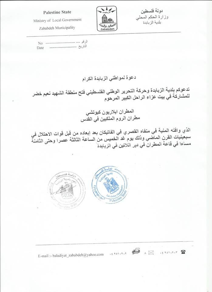 اعلنت بلدية الزبابدة وحركة التحرير الوطني الفلسطيني فتح / منطقة الشهيد نعيم خضر عن اقامة بيت عزاء للراحل المناضل المرحوم المطران ايلاريون كبوتشي وذلك يوم غد الخميس الساعة الثالثة عصرا وحتى الثامنة مساءا في قاعة المطران في دير اللاتين في بلدة الزبابدة