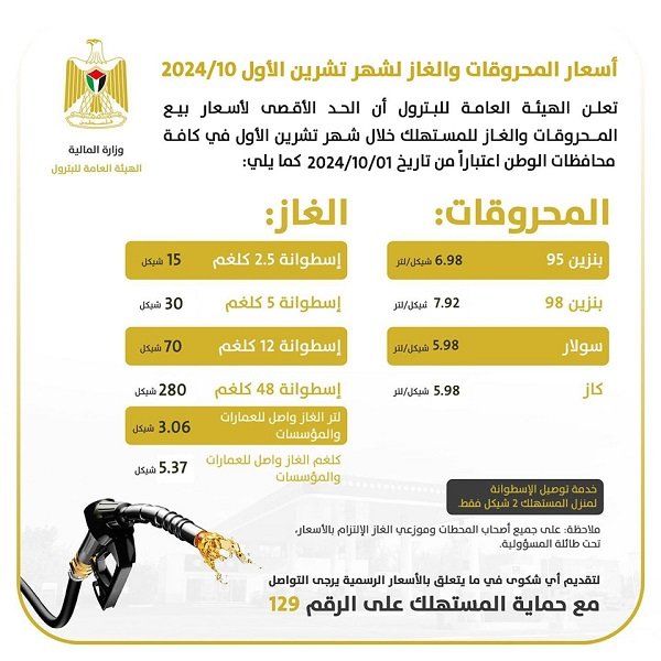 وانخفض سعر لتر البنزين (95 أوكتان)، الأكثر شيوعا واستخداما، بواقع 13 أغورة مقارنة مع أسعار شهر أيلول/سبتمبر، ليصل إلى 6.98 شيقلا. كما انخفض سعر لتر البنزين (98 أوكتان) بواقع 13 أغورة أيضًا ليصل إلى 7.92 شيقلا.