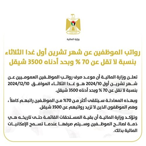 أعلنت وزارة المالية أن موعد صرف رواتب الموظفين العموميين عن شهر تشرين الأول 2024، هو يوم غد الثلاثاء، بنسبة لا تقل عن 70% وبحد أدناه 3500 شيقل.