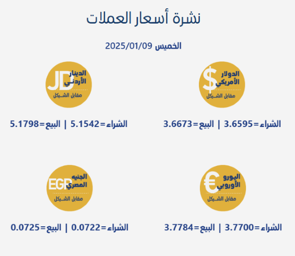 اسعار صرف العملات صبا.نت - جاءت أسعار صرف العملات مقابل الشيقل الإسرائيلي، اليوم الخميس، بحسب سلطة النقد الفلسطينية، على النحو التالي: calendar_month09/01/2025 09:31 visibility 253 مقالات ذات صلة share الاحتلال يعتقل شابين من عقابا شمال طوباسshare الحكومة: قرارات طارئة لمواجهة الأزمة المالية واعتماد دوام جزئي للموظفينshare اتحاد نقابات العمال يجدّد التزامه بحماية العمال ويكشف عن استشهاد 74 عاملًا خلال 2025share "المواصلات" تعلن بدء تنفيذ خصم رسوم الترخيص ورخص قيادة الموظفين والمتقاعدين من مستحقاتهم
