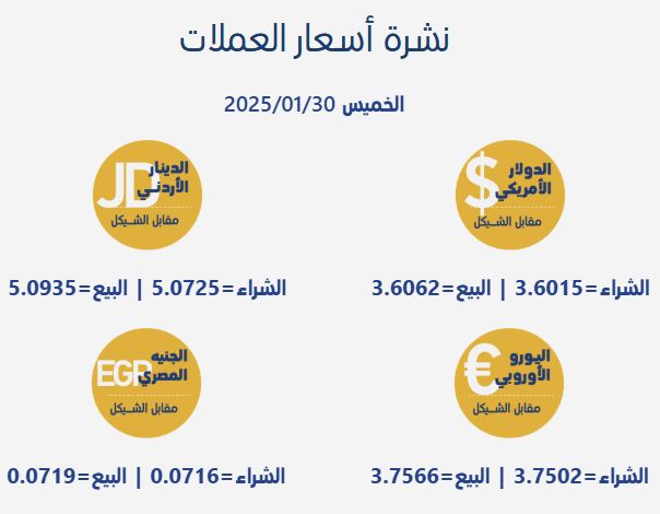 أسعار صرف العملات صبا.نت - جاءت أسعار صرف العملات مقابل الشيقل الإسرائيلي، اليوم الخميس، بحسب سلطة النقد الفلسطينية، على النحو التالي: calendar_month30/01/2025 09:41 visibility 370 مقالات ذات صلة share الحكومة: قرارات طارئة لمواجهة الأزمة المالية واعتماد دوام جزئي للموظفينshare اتحاد نقابات العمال يجدّد التزامه بحماية العمال ويكشف عن استشهاد 74 عاملًا خلال 2025share "المواصلات" تعلن بدء تنفيذ خصم رسوم الترخيص ورخص قيادة الموظفين والمتقاعدين من مستحقاتهمshare إجلاء 47 مسافرا بينهم مرضى عبر معبر رفح البري