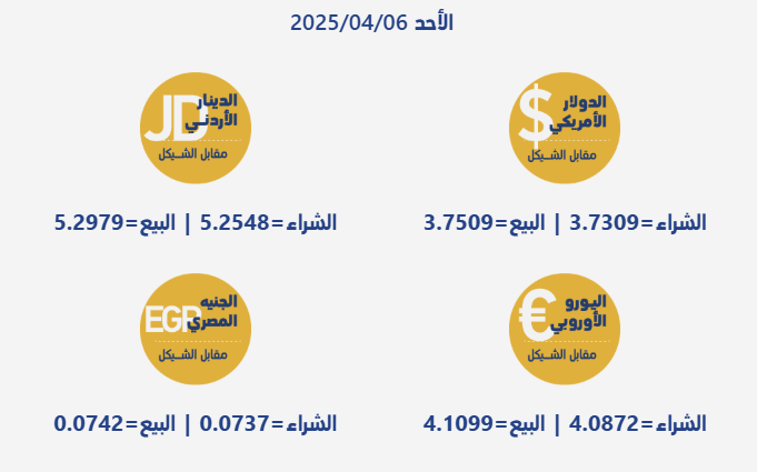 أسعار صرف العملات صبا.نت - جاءت أسعار صرف العملات مقابل الشيقل الإسرائيلي، اليوم الأحد، بحسب سلطة النقد الفلسطينية، على النحو التالي: calendar_month06/04/2025 10:20 visibility 162 مقالات ذات صلة share مذكرة تفاهم لتسريع تعافي البنية التحتية وإعادة إعمارها في فلسطينshare سموتريتش يعلن: لن يتم تحويل أموال المقاصة للسلطة هذا الشهر أيضاshare الاحتلال يعتقل شابين ويغلق مداخل بلدة الرام شمال القدسshare الاحتلال يعتقل شابين من مدينة طولكرم