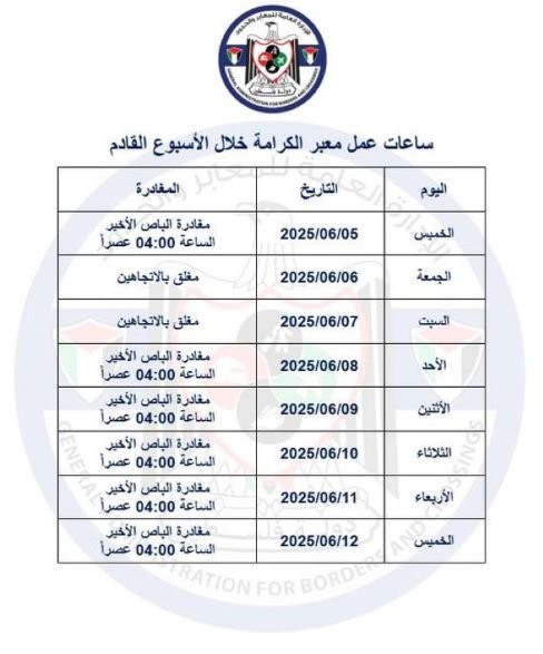 - نوهت الهيئة المعابر والحدود الفلسطينية الى تعديل على ساعات عمل معبر الكرامة خلال عطلة عيد الأضحى المبارك لعام 2025، وذلك وفقاً للترتيبات التالية: