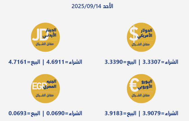 أسعار صرف العملات صبا.نت جاءت أسعار صرف العملات مقابل الشيقل الإسرائيلي، اليوم الأحد، بحسب سلطة النقد الفلسطينية، على النحو التالي: calendar_month14/09/2025 10:06 visibility 147 مقالات ذات صلة share ارتفاع أسعار النفط والذهبshare ارتفاع أسعار النفط والذهب عالمياshare أسعار صرف العملاتshare الإحصاء الفلسطيني: ارتفاع عجز الميزان التجاري للسلع المرصودة* بنسبة 9% خلال شهر تموز، 07/2025، مقارنة مع شهر تموز 2024