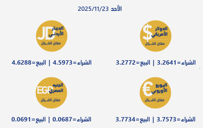 أسعار صرف العملات صبا.نت - جاءت أسعار صرف العملات مقابل الشيقل الإسرائيلي، اليوم الأحد، بحسب سلطة النقد الفلسطينية، على النحو التالي calendar_month23/11/2025 09:41 visibility 61 مقالات ذات صلة share أسعار العملات مقابل الشيقلshare أسعار العملات مقابل الشيقل share "الإحصاء": انخفاض حاد في أسعار السلع الاستهلاكية في قطاع غزةshare ارتفاع أسعار الذهب مدعوما بتراجع الدولار