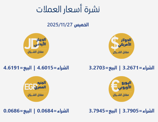 أسعار صرف العملات صبا.نت- جاءت أسعار صرف العملات مقابل الشيقل الإسرائيلي، اليوم الخميس، بحسب سلطة النقد الفلسطينية، على النحو التالي: calendar_month27/11/2025 10:26 visibility 101 مقالات ذات صلة share انخفاض أسعار النفط واستقرار الذهب عالمياshare الاحصاء الفلسطيني: مؤشر أسعار تكاليف البناء والطرق وشبكات المياه وشبكات المجاري في الضفة الغربية لشهر 10/2025share انخفاض أسعار الذهب والنفط عالمياshare أسعار صرف العملات