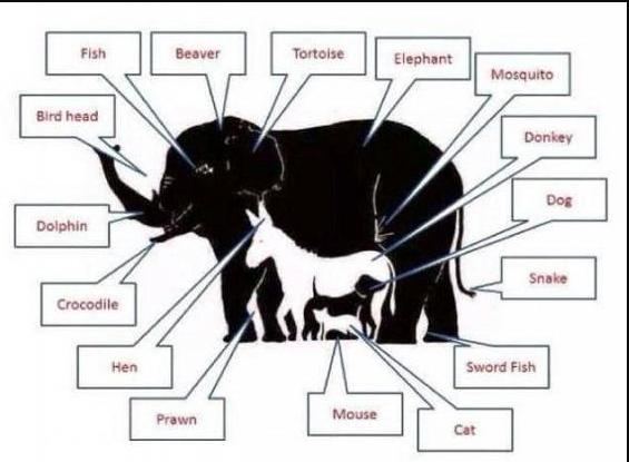 شاشة نيوز-وكالات-يبدو أن الصورة التي تظهر أمامك ليست بها إلا أربعة حيوانات فقط وهم (الفيل - الحمار - القط - الكلب) إلا أن من صمم هذه الصورة وضع بداخلها 16 حيوانا مختلفا ولكن الخداع البصري سيجعل الأمر صعبا دون النظر إلى الصورة الموجودة أسفل هذا الخبر