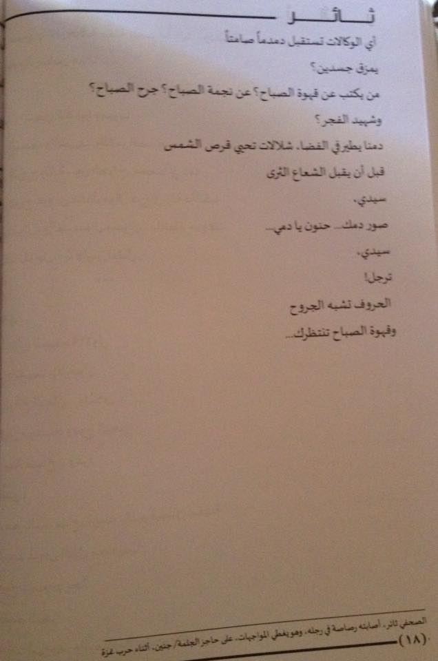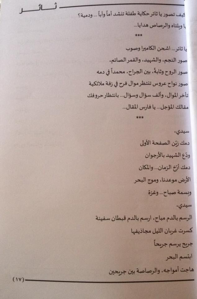 كتب ثائر ابو بكر/ هذه القصيدة والتي هي بعنوان ” ثائر لن تقعدة الرصاصة ” والتي أفتخر بها وشرفني بها ضمن ديوان وإصدار شعري جديد بعنوان ” طقوس بحرية ” التي أهداني إياها وألفها الصديق والإنسان والشاعر والأديب والمعطاء صاحب الإحساس والمشاعر الأستاذ عمر عبد الرحمن نمر مدير العلاقات العامة والإعلام في تربية قباطية بعد إصابتي وأقعدتني لأكثر من عام بنيران الوحدات الخاصة المستعربة وإستشهاد الشهيد محمد ابوالرب وإصابة أكثر من 30 شابا خلال مسيرة سلمية على حاجز الجلمة العسكري بتاريخ 25-7-2015 تضامنا مع أهلنا في قطاع غزة