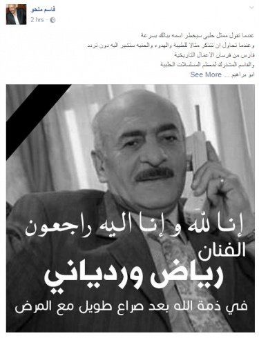 توفي الممثل السوري رياض وريداني اليوم الاربعاء، وذلك بعد صراع طويل مع مرض السرطان.