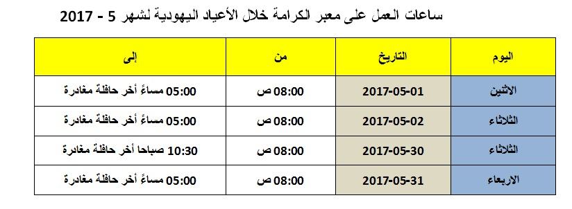 ادارة المعابر: تعديل على ساعات عمل معبر الكرامة الشهر المقبل صبا.نت-قالت ادارة المعابر والحدود ،اليوم الأربعاء، انه اجري تعديل في ساعات عمل معبر الكرامة خلال شهر أيار المقبل، بسبب الاعياد اليهودية . يوضح الجدول المرفق ساعات عمل المعبر خلال شهر ايار المقبل. calendar_month26/04/2017 17:36 visibility 1,075 مقالات ذات صلة share لجنة الانتخابات تعلن النتائج النهائية للانتخابات المحلية 2026share الشعب الفلسطيني ينحاز لخيار الديمقراطية: أكثر من نصف مليون ناخب وناخبة في الانتخابات المحليةshare الرئيس يدلي بصوته في الانتخابات المحلية بمدينة البيرةshare رئيس الوزراء يتفقد غرفة العمليات المشتركة للأجهزة الأمنية لمتابعة سير عملية الاقتراع